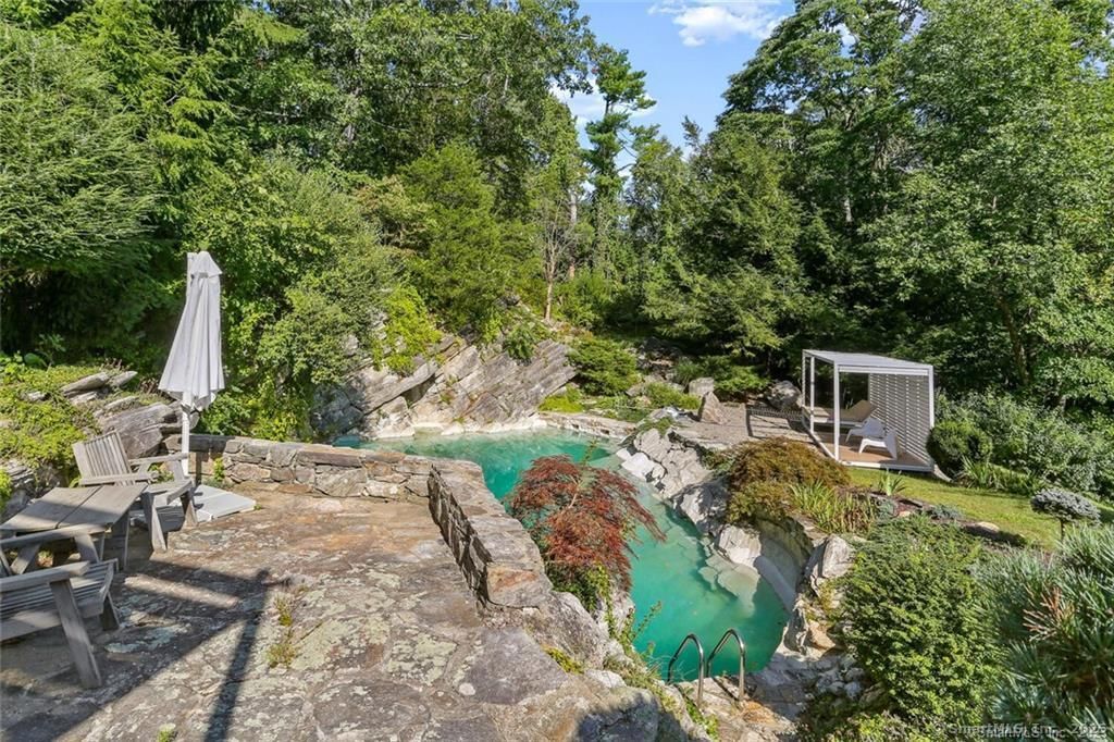 Available for July at $20,000 or June $14,500. The Otnes House is a true floating oasis and now available as a summer rental! This rolling property overlooks nearly 3.5 acres, complete with a one-of-a-kind pool carved into a natural stone quarry with beautiful surrounding gardens. John Johansen of the celebrated Harvard Five designed this mid-century modern for famous collage artist Fred Otnes, who lived here for over 50 years. Walls of glass bring in beautiful natural light; expansive decks & pergolas have created an open floor plan concept to bring the outside in. The renovated kitchen features Bauformat cabinetry and high end European appliances, and the primary bedroom has a sitting room, office area and attached artist studio. Two additional bedrooms and two bathrooms complete the main house, and adjacent to the home is a two-car garage with ample room for storage or an additional studio space. The property is approximately 50 miles/90min from New York City and 5 minutes to a Metro-North stop which takes you directly to Grand Central. Redding offers an abundance of trails, nearby shops and restaurants of Westport, Darien and Ridgefield. A wonderful place to call home.