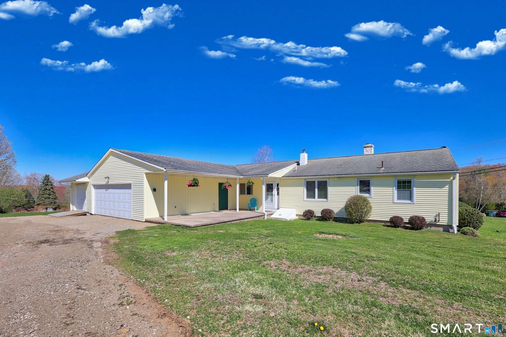 Charming ranch with easy one-level living! This 3 bedroom 2.5 bath home welcomes you in through a covered front porch, perfect for morning coffee or unwinding at the end of the day. Enjoy the views of your open yard and appreciate the gorgeous sunsets. Inside, you'll find beautiful hardwood floors and large bay windows in both the living and dining rooms, bringing in great natural light. All 3 bedrooms also feature hardwood floors. Convenient laundry on the main level inside the half bath. You'll appreciate the built-ins and tons of storage throughout. The eat-in kitchen offers plenty of space and flows into a mudroom with access to the garage; super convenient everyday living. The partially finished lower level adds even more flexibility with a summer kitchen and space that could work well for an in-law setup, rec room or extended living area. A few steps further, you will find the utility room with potential for a workshop. Outside, there's a large open yard just under an acre, and a two bay garage. Attached to the garage is a woodshed where hobbyist alike will enjoy the convenience for storing motorcycles, lawn equipment and beyond. There is also a great storage shed in the yard, making it convenient for the handy man. Great space, great layout and plenty of potential, don't miss this one!